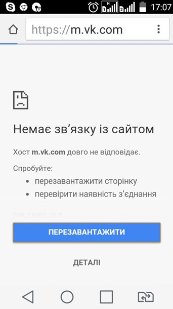 При попытке зайти на сайт vk.com с помощью мобильного интернета от Vodafone, страница социальной сети ВКонтакте не отображается и появляется сообщение «нет связи с сайтом».